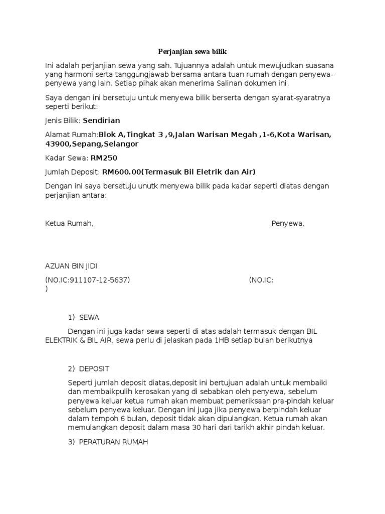 Contoh Surat Perjanjian Baku. Nama penyewa Nombor telefon Peranan dan tanggungjawab kedua. Perjanjian Sewa Rumah Bilik.